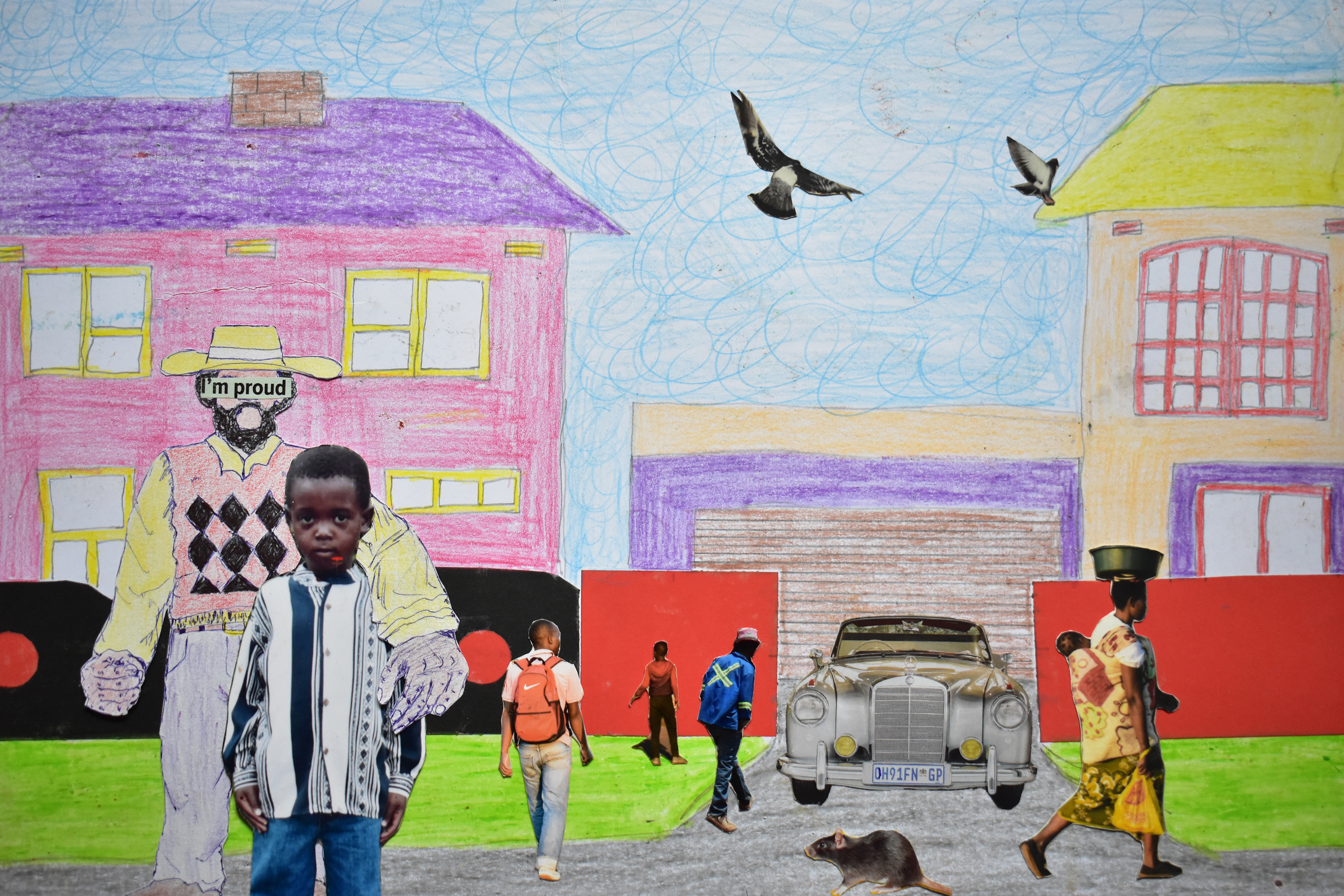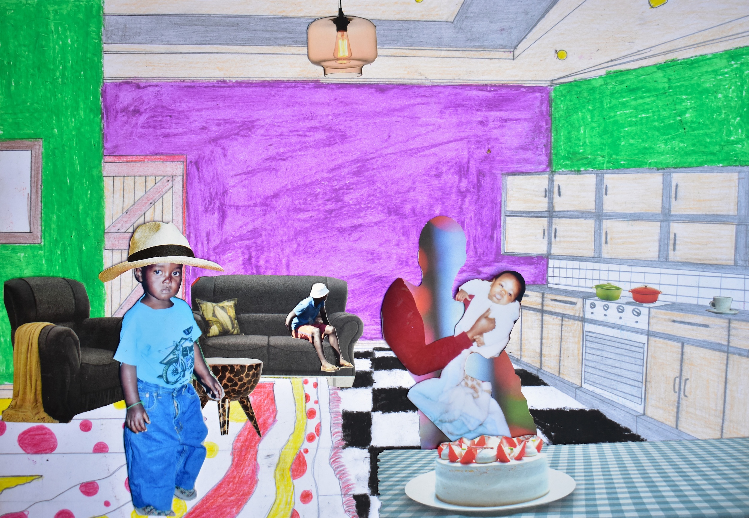 Mabheka’s immersive installation surrounds visitors, drawing us into his inner world. Moving around as he grew up, he never felt tied to one childhood home and has scant few family photographs. While on the Of Soul and Joy training programme, he discovered documentary photography and began experimenting with a technique that blends hand-drawn scenes. Into these he places photo cut outs of himself and close relatives, directing figures (a sketch of an idealised father he never met, a cut out of his mother holding the baby she cared for far away as a domestic worker) like puppets to materialise memories that never existed for him as images.